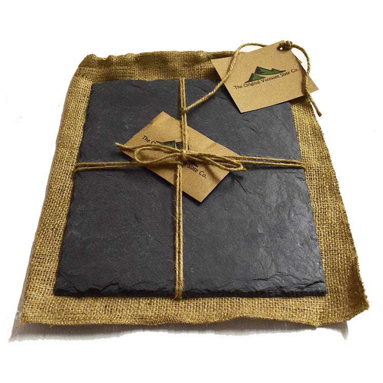 - Each slate board is delivered in a burlap bag, along with soapstone pencils and cork feet.